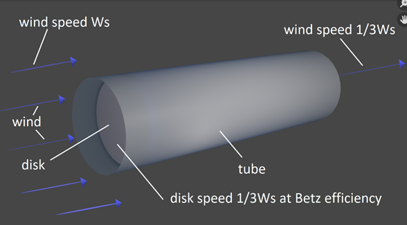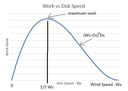 Imagine a tube oriented parallel with the wind that has a thin disk inside it. As the wind enters the tube it hits the disk which causes a pressure on the disk that moves the disk down the tube doing work. One definition of work is force times displacement in the direction of the force. In our ideal wind engine, assuming the force is constant, the amount of work done by the disk is the force on the disk times the distance it moves. One might ask what the speed of the disk should be to extract the most work out of the wind. Obviously, if the disk is not moving the pressure from the wind would be the maximum but since the disk is not moving it doesn’t do any work. And if the disk is moving as fast as the wind there is no force on the disk and there is no work being done. Clearly, between those two extremes, there is an optimum speed at which the disk should move down the tube to maximize the amount of work done.